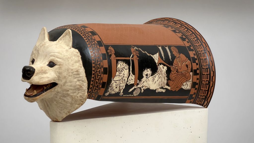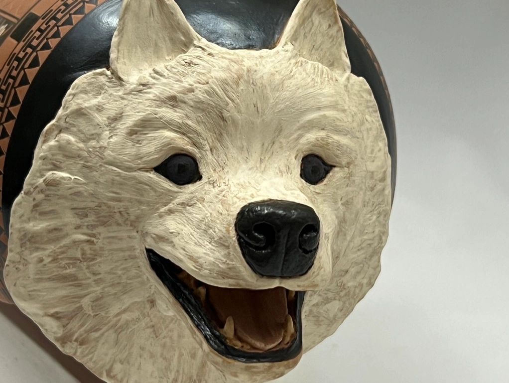 Dog head sculpted by Aggeliki Dervenioti. Imagery designed and painted by the artist.
